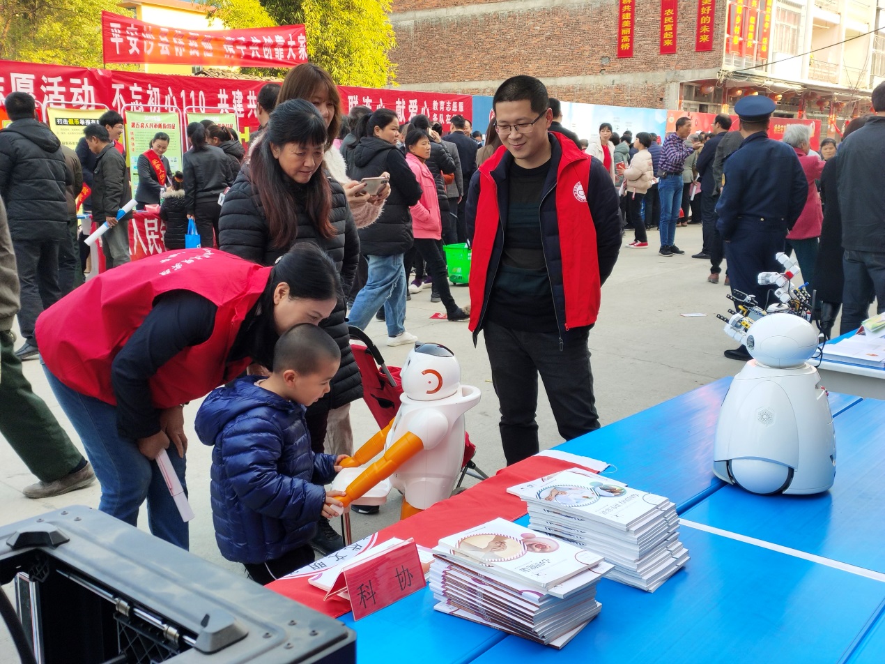 (县科协的另一科技展示项目——机器人,正与小朋友互动)