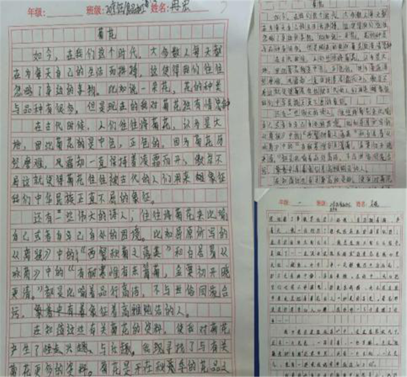 黄花不负秋,与秋作光辉。欣赏完多姿多彩的秋菊,同学们心情愉悦地回到了课堂,开展了一场以“菊花”为主题、体裁不限、500字以上的作文竞赛。