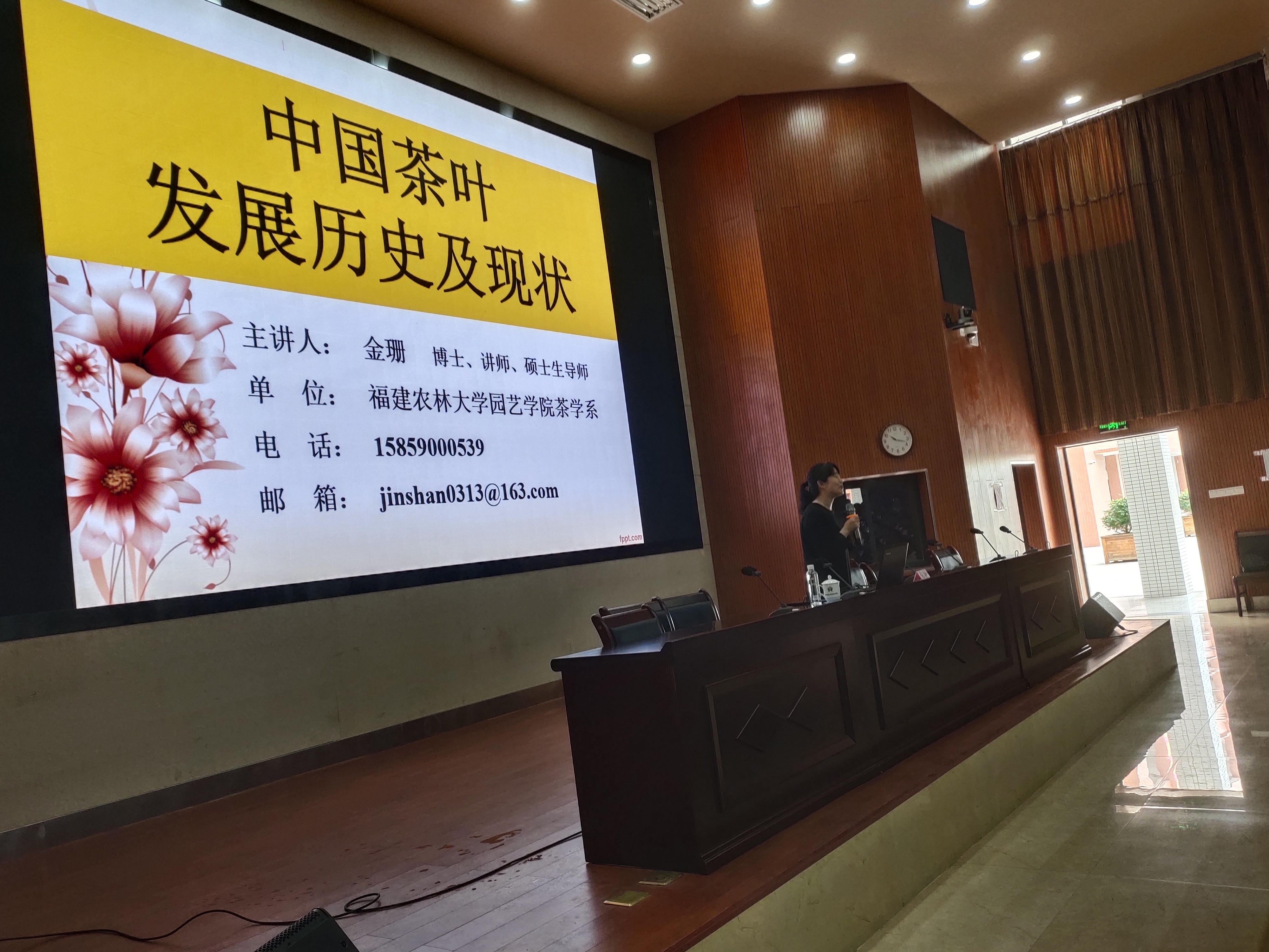 主讲专家金珊,是福建农林大学园艺学院茶学系实验室主任,茶学博士、硕士研究生导师,国家一级茶艺技师、一级品茶师、茶艺师国家职业技能鉴定考评员。她以直观丰富的图片、平实生动的语言,条理清晰地向大家讲述了《中国茶叶发展历史及现状》,丰富了听讲师生的茶文化知识,让大家更系统、全面地领悟中华茶文化的博大精深;在座学生们也从金珊博士广博的学识中领会“爱国、创新、求实、奉献、协同、育人”的中国科学家精神,进一步激发了崇尚科学,学习科学的意愿,坚定了扎实学好专业知识、矢志报效祖国的信心。